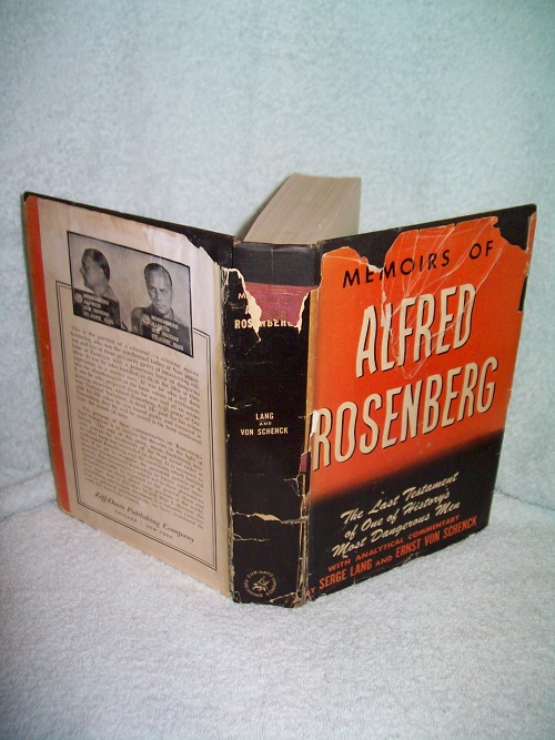 Ziff-Davis Publishing Company, Chicago, 1949, First thus. Translated from the German by Eric Posselt. Analytical commentary by Serge Lang and Ernst Von Schenck. Hard cover, 328 pages. Black boards with publisher and logo in gilt on spine; two red cloth labels, one with title in gilt in 3-ruled gilt frame; second label is smaller (possibly clipped as it is not quite square on the spine) with only two gilt rules showing top and bottom and none at the sides; names of Lang and Von Schenck in gilt have been rubbed away. Board corners and bottom edges show wear; spine ends bumped with some wear. Boards show some marks and stains primarily from tape repairs on verso of jacket. Binding is sound; bit of soil on outer page block. Dust jacket has price intact, but has been heavily repaired on verso; still shows losses along most edges, with several large losses as well, tears and losses along folds; faded water marks, some soil and age-toning. Text clean and unmarked, pages lightly tanning, one straightened dog-ear; black & white frontis of Rosenberg. ‘The inspiration for the murderous blood-bath in which the German Reich indulged can be traced directly to Rosenberg’s unbridled hatred for the Slavic East and his strange anti-Semitic fixation. This cowardly egocentric – moody, retiring, and maudlin – yet glibly persuasive in his warped preachings, succeeded in setting aside the laws of civilization. The consequences of his teachings were deadly, not only for Germany and Europe, but probably for the entire world.’ (from front flap)