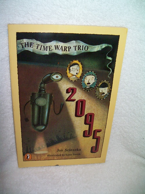 Puffin, New York, 1997, 1st pr. thus.  ISBN 0-14-037191-5.  Trade soft cover, 72 pages.  Unread copy, remainder mark on bottom edge; black & white illustrations by Lane Smith.  ‘Zapped into the twenty-first century by The Book, Fred, Sam, and Joe find that the future is definitely worth waiting for.  Actually, waiting forever would be okay.  3-D ads attack them on the street.  Ray gun-toting robots demand their ID numbers – or else.  And a meeting with their great-grandkids could knock out the old family tree at the roots.  Will the trio’s future mix-up wipe out their past?  Only the time-warped future will tell!’ (from rear wrap)