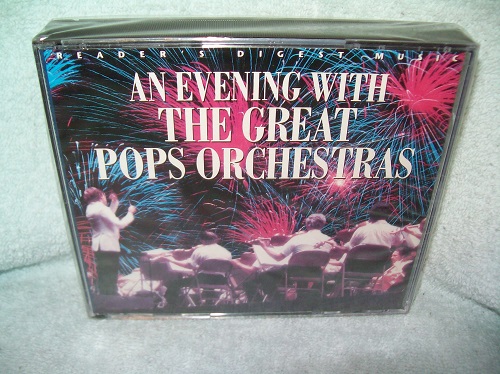 Reader’s Digest Music, Canada, 2000. 4 audio CDs, still in manufacturer’s shrink wrap. Disc 1 – Arthur Fiedler and the Boston Pops; Disc 2 – John Williams and the Boston Pops; Disc 3 – The National Pops Charles Gerhardt, Conductor; Disc 4 – The New York Pops Skitch Henderson, Conductor.