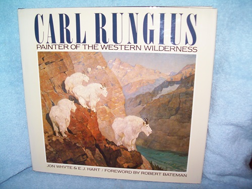 Douglas & McIntyre, Vancouver, 1985, 1st.  ISBN 0-88894-474-8.  Hard cover, 184 pages including notes.  Near fine; blue boards with gold lettering on spine, binding sound with head bands; touch of foxing on top edge.  Dust jacket has very light edge and cover wear, scrape and a bit of crimping at upper spine end.  Book interior clean and unmarked with black & white photos and colour plates.  Foreword by Robert Bateman.  ‘Carl Rungius was a master portrayer of the great game animals of western North America. … he was heading for the Wyoming wilderness to hunt, paint and sketch what for him were exotic animals in their natural habitat.  Each year thereafter he ventured west again, following the lure of open country, exulting in the opportunity to paint in the freedom of the wild.’ (from front flap)