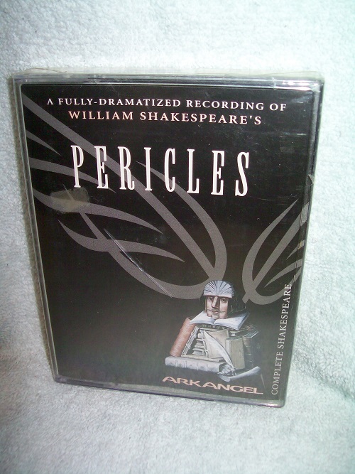Penguin Audio, 1998, Arkangel Complete Shakespeare. ISBN 0-14-086891-7. 2 audio cassette tapes with an approx. playing time of 2 ½ hours, still in manufacturer’s shrink wrap, crack on front and original price sticker on rear. Sir John Gielgud plays Gower and Nigel Terry is Pericles, Thaisa is played by Stella Gonet and Marina by Julie Cox. ‘Pericles, Prince of Tyre, undergoes a tyrant’s fury, storm and shipwreck. He wins love and suffers loss, but what is lost may also be found. With the ancient poet Gower acting as narrator, we follow the adventures of Pericles from young manhood to maturity. This strange and powerful tale of loss and recovery is the first in the group of romance comedies created by Shakespeare at the end of his dramatic career.’ (from rear case)