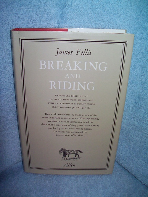 J. A. Allen, London, 1986 reprint of 1902 edition.  Unabridged English text with a foreword by E. Schmit Jensen (F.E.T. Dressage Judge 1948-55).  Translation by M. H. Hayes.  ISBN 0-85131-31044-3.  Hard cover, 359 pages including Index.  Red cloth with gold lettering and illustration on spine; very light corner and spine end wear; binding sound.  Dust jacket with price intact has light edge and cover wear, some creasing; old waster mark at bottom of rear flap fold with a bit of red transfer.  Penic erasure on FEP; remainder of interior clean and unmarked with one straightened corner bend; black & white frontis of author; 70 illustrations; fox spots on top and bottom page block.  ‘This work, considered by many as one of the most important contributions to Dressage riding, consists of succint (sic) instruction based on the author’s experience of sixty years’ serious study and hard practical work among horses.  The author was considered the greatest rider of his time.’ (from front panel)