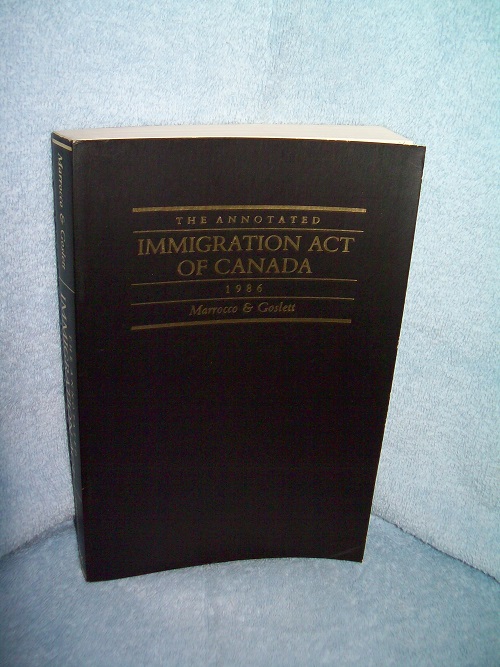 Carswell, Toronto, 1985. ISBN 0-459-39280-8. Trade soft cover, 388 pages including Index. Light edge and cover wear, small corner creases, light creases on spine. Binding sound; small spot on fore-edge page block. Prior owner’s info on first/title page; remainder of interior clean and unmarked; stapled pamphlet of Refugee Claims Backlog Regulations not included in this publication laid in. ‘This 1986 edition of the Annotated Immigration Act contains annotations of what we believe to be all of the relevant decisions reported to July 1, 1986, which purport to interpret the various sections of the Immigration Act and Regulations.’ (from Preface)