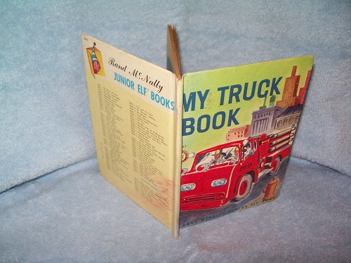 Rand McNally, Chicago, 1961, # 8062 with 19 cent price sticker. Small vintage hard cover, unpaginated. Boards show some edge and cover wear, wear at corners and spine ends; reading creases. Boards show light age toning, some rubs, red streaks on front and rear. Binding sound. Illustrated end papers; interior clean and unmarked with browning pages; colour illustrations by George Wilde. A Rand McNally Junior Elf Book. Rhyming verses about various trucks and what they do.