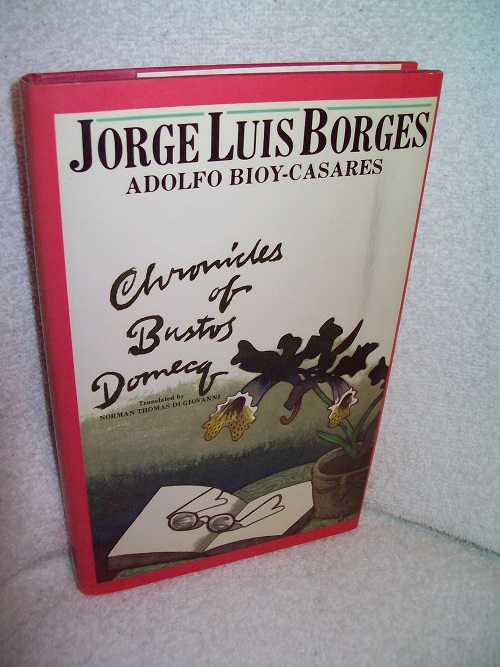 Allen Lane, London, 1982, 1st thus. ISBN 0-7139-1109-3. Hard cover, 143 pages. Very good plus; binding tight, light edge wear, top spine edge bumped. Dust jacket with price intact shows light edge and cover wear, spine a bit sunned; some age spots along upper and lower flap edges. Interior clean and unmarked with just a hint of age spotting on upper and lower text block edges. Translated by Norman Thomas di Giovanni. ‘In these Chronicles, Honario Bustos Domecq, a seedy journalist and pompous poseur, is involved in a hilarious series of spoof essays in which he inverts, deflates and dismantles most of the aesthetic fads of our time. “… The result, which Domecq never perceives, is invariably monstrous: novels and poems that cannot be read, art that cannot be seen, architecture that cannot be used … With donnish humour and unfailing intelligence, Chronicles of Bustos Domecq thrusts a rapier into such gargantuan posturing”-Time. H. Bustos Domecq is the joint pseudonym of Borges and his friend Adolfo Bioy-Casares.’ (from front flap)