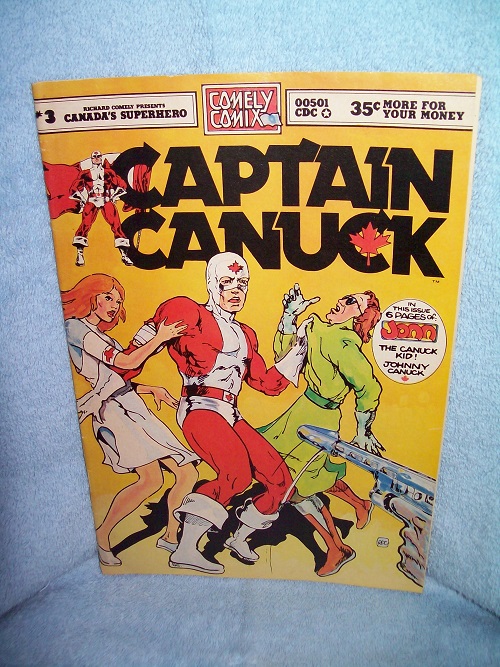 Comely Comix, Winnipeg, Manitoba, 1975, Richard D. Comely/Comely Comix. Soft cover comic, unpaginated. Bit of wear along top front edge; several tears along spine but covers are holding by top staple; slight roll to spine and faint creases along spine. Interior clean and unmarked; colour artwork. ‘In this issue 6 pages of Jonn the Canuck Kid! Johnny Canuck’ (from front wrap)