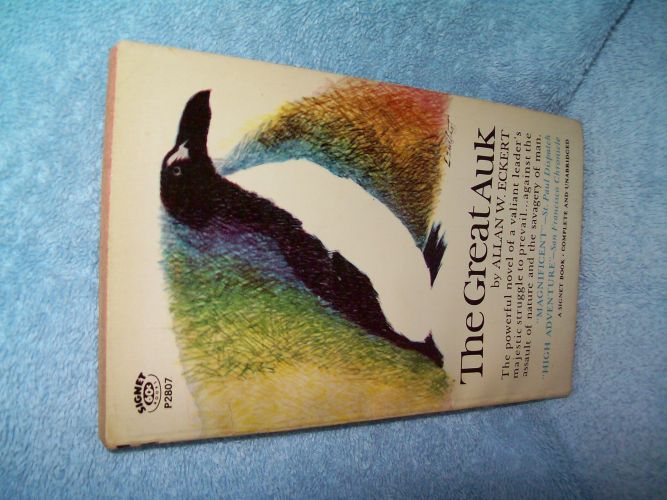 Signet/New American Library, Toronto, December 1965, 1st pr thus.  P2807.  MMPB, 127 pages.  Wraps have some edge and cover wear, score on front wrap near spine onto spine; light corner crease, some stress lines and age toning/spots; binding tight; outer page block tinted red with age spotting on upper block.  Interior clean and unmarked with tanned pages.  ‘a novel of awesome adventure.  It is the stirring story of a leader, last of a doomed species of flightless birds.  It is the dramatic chronicle of a monarch who survived the onslaught of his natural enemies, of storms and sharks and killer whales…only to fall prey to a pitiless executioner-Man.’ (from rear wrap)