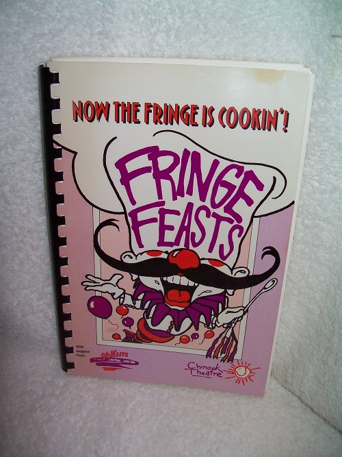Chinook Theatre Society, Edmonton, AB, 1990.  Plastic comb-bound soft cover, 145 pages including Index and blank page for favourite recipes.  Laminate covered card covers with small light stain at top edge, bit of laminate lifting at lower corner.  Gift inscription on verso of front cover; remainder of interior clean and unmarked with white, bright pages.  No cooking soil; no flaws to comb; no tears to pages.  ‘We asked fringers from all over to give us their favourite recipes, and the result is this delectable collection of FRINGE FEASTS!!  Artists, volunteers, local restaurants and friends, media, festival funders, and other assorted riff-raff (including several closet chefs) have donated their special kitchen secrets to give our cookbook a festive flavor. … Scattered throughout this cookbook you will find Fringe titles from 1982 to the present that are linked by one theme:  FOOD!!’ (from Introduction)