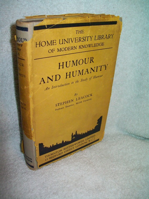 Thornton Butterworth, London, 1937, 1st. Hard cover, 254 pages including Bibliography and Index. Very good; green cloth the black lettering and logo on front board, black lettering on spine that shows a bit of sunning. Light corner and spine end wear; binding sound. Dust jacket worn with tears and losses along edges and corners, larger losses at spine ends. Interior clean and unmarked. Book # 184 in The Home University Library Of Modern Knowledge series. ‘The author has given to this book the title Humour and Humanity, rather than the obvious and simple title Humour, in order to emphasize his opinion that the essence of humour is human kindliness. It is this element in humour which has grown from primitive beginnings to higher forms: which lends to humour the character of a leading factor in human progress, and which is destined still further to enhance its utility to mankind.’ (by Stephen Leacock from Preface)