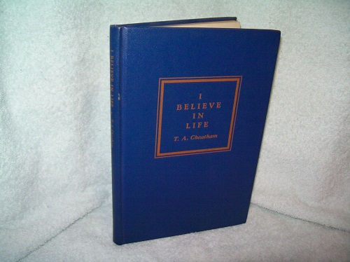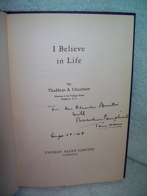 Thomas Allen Limited, Toronto, 1949.  Hard cover, 79 pages.  Blue buckram with boxed orange lettering on front, orange lettering on spine.  Light edge, corner and spine end wear; binding sound; no jacket.  Bit of residue on FEP from book plate having been removed; remainder of interior clean and unmarked.  Inscribed to prior owner on title page ‘with Publisher’s Compliments – Tom Allen – Sept. 26 – 49’.  ‘For a number of years he has been conducting classes in Personal Religion and in these classes the basic object has been to achieve the Abundant Life that Jesus came to bring. … There have been many requests that these simple lectures be published just as they were delivered … It is sent out with the prayer that it may help others find the reality of the spiritual through the needs of the physical.’ (from Foreword)