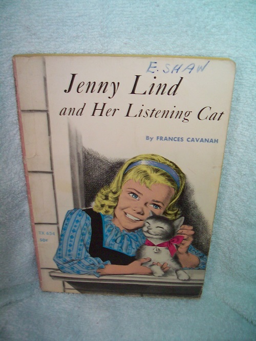 Scholastic, New York, 1970, 4th pr.  TX 634.  Trade soft cover, 90 pages including Glossary and Note from the Author.  Good; wraps show edge and cover wear, some creases, short edge tears, horizontal tear 1 ½” at rear to across spine to ½” onto front wrap.  Name inked on front near top edge; binding sound with a very slight bottom curl.  Interior clean and unmarked with tanned pages.  ‘Jenny is so lonely.  Her mother is too busy to take care of her, and her father is almost never home. … One day the lonely girl finds a lonely cat. … Her cat listens to her beautiful voice.  … one day someone very special hears her singing.  That’s when life changes for Jenny Lind, the little Swedish girl who became one of the world’s greatest singers.’ (from rear wrap)