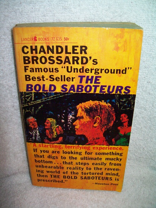 Lancer, New York, 1962, believe 1st pr thus. 72-635. Complete and unabridged. MMPB, 252 pages. Good reading copy; wraps show some edge and cover wear, a few spots on wraps and outer page block, small corner bends; binding currently tight with no cracks; spine not creased. Due to age and glued binding, the book should be read with care. Inked note on first page and rear end paper; remainder of interior clean and unmarked with lightly tanned pages. ‘Famous “Underground” Best-Seller. A startling, terrifying experience. If you are looking for something that digs to the ultimate mucky bottom … that steps easily from unbearable reality to the ravening world of the tortured mind, then The Bold Saboteurs is prescribed.’ (from front wrap)
