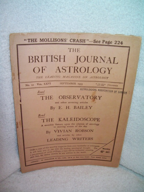 W. Foulsham, London, 1933. Paper cover stapled magazine, pages 221-240. Covers detached; some marks and soil, edge and cover wear; some creases, edge tears and losses; Astrological Association of Canada stamped on front and upper margin of first page. All pages present, some edge wear and creases; rust on staples. ‘The Leading Magazine on Astrology’