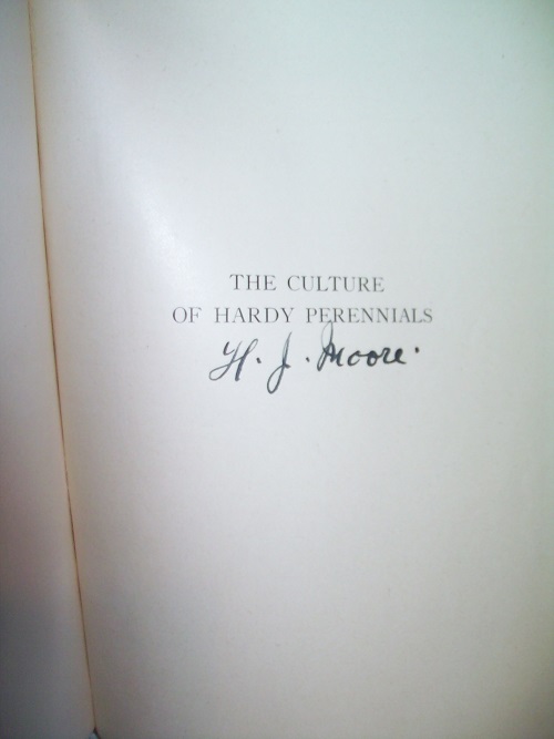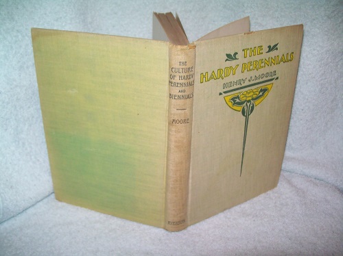 Ryerson Press, Toronto, 1933, 1st.  Hard cover, 292 pages including Index and Errata.  Green cloth with some fading; corners worn with some board exposed and a bit of fraying; spine ends worn with some short tears to cloth and small losses; old water mark at upper rear fore-edge corner.  No jacket.  Interior clean and unmarked; colour frontis and plates; black & white photos and illustrations.  SIGNED by author on half-title page in (fountain pen) ink.  ‘… the culture of each subject is fully detailed.  Information as to soils, positions to which the plants are adapted, height, colour of flowers, and natural habitat is given.  The botanical names at the head of each article are given first and are followed, where such exists, by the common name.  Lists of plants for various positions, latitudes and uses will be found.  The natural order of each plant is specified and the meanings of the generic names are given.’ (from Introduction)  Dr. Henry J. Moore of Islington, Ontario, Canada envisioned The International Peace Garden to commemorate the long, peaceful coexistence of Canada and the United States.  The Garden, located on the border near Boissevain, Manitoba and Dunseith, North Dakota, was dedicated on July 14, 1932.
