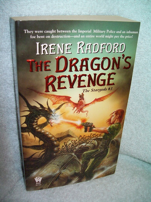 Daw, New York, 2005, 1st. Daw Book Collectors No. 1344. ISBN 0-7564-0317-0. MMPB, 420 pages. Unread copy; tiny tear at rear fore-edge wrap; pages lightly tanned. Cover art by Luis Royo. ‘Fleeing the Terran Imperial Military Police, the three O’Hara brothers found a safe haven on a world off the star maps. Hailed as the Stargods by the locals whom they’d rescued from the cruel rule of a rogue dragon able to take on human form, the brothers were committed to the people of this magical world though they still sought to free themselves from the charges they faced back home.’ (from rear wrap)