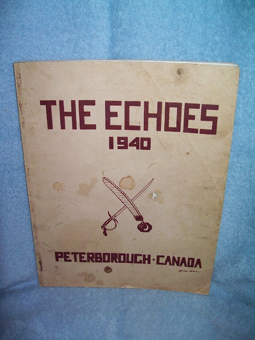 Self-published yearbook, 1940. Card covers, 96 pages. Wraps show edge and cover wear, stains, creases and age spotting; small hole in front wrap; binding sound; old water mark on verso of front cover. Interior pages lightly tanned, occasional soil smudge/age toning; old water marks visible in lower edges of some pages and rear cover. Illustrated with black & white photos and drawings. 1940 yearbook for Peterborough Collegiate and Vocational School, Peterborough, Ontario (World War II era)
