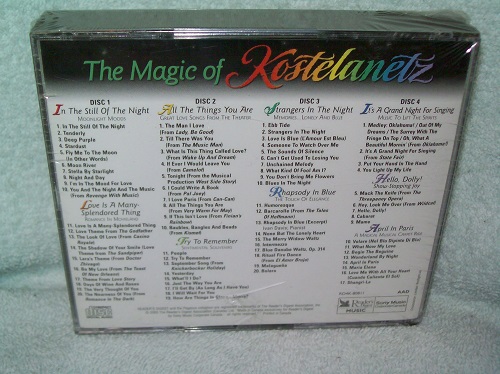 Reader’s Digest Music, Canada, 2003. 4 audio CDs, still in manufacturer’s shrink wrap; small crack on rear case. Disc 1 – Moonlight Moods, Romance in Movieland; Disc 2 – Great Love Songs From the Theater, Sentimental Souvenirs; Disc 3 – Memories … Lonely and Blue, The Touch of Elegance; Disc 4 – Music To Lift the Spirits, Show-Stopping Joy, A Magical Musical Carpet Ride.