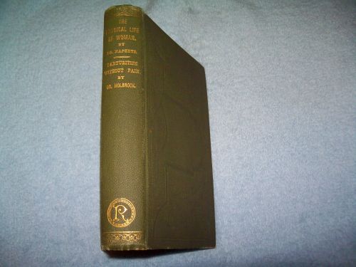 Rose Publishing, Toronto, 1880, 3rd ed. Hard cover, 382 pages including Contents, Notes and Appendix. Green pebbled cloth with front board embossed; gold lettering and design on spine. Some edge, corner and spine end wear; head and tail bands, small stains and rubs on boards; binding sound but cracked in spots with all pages secure. Occasional small pencil mark to interior; some age spotting throughout; pages tanned. Includes: Advice To The Maiden, Wife, and Mother /A Code of Directions For Escaping From The Primal Curse. ‘It treats in detail three particular phases of woman’s life, viz: maidenhood, matrimony and maternity.’ (from Synopsis)