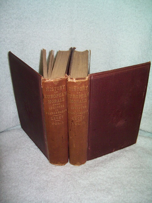 Longmans, Green, and Co., London, 1890, Ninth Edition in Two Volumes.  Hard covers; brown boards with blind rules and decorations on front and rear boards, gilt lettering on spines.  Boards show edge and cover wear, some rubs and spots.  Corners bumped and worn with some board exposed; spine ends bumped and worn with some short tears and small losses to cloth.  Binding sound with slight lean; some cracks/splits at gutters but all pages secure.  Charcoal end papers; pages lightly tanned; a few fox spots.  Volume 1 has 468 pages, Volume II has 407 pages including Index plus 24 pages of publisher’s ads; a few pencil notes on rear end paper.  Volume I deals with The Natural History of Morals, The Pagan Empire, The Conversion of Rome; Volume II deals with From Constantine to Charlemagne and The Position of Women.