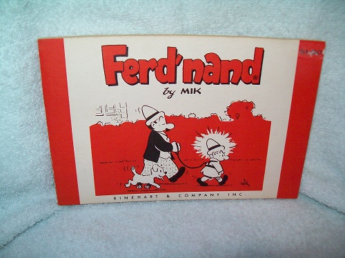 Rinehart & Company, New York, 1957.  Oblong soft cover, unpaginated.  Wraps have light edge wear, small scars and residue on front and rear from sticker removal; short tear at upper front spine edge; light stain on rear wrap.  Interior clean and unmarked with lightly tanned pages.  Compilation of black & white panels from newspaper comic strips from 1954 to 1957 of Ferd’nand by Mik.