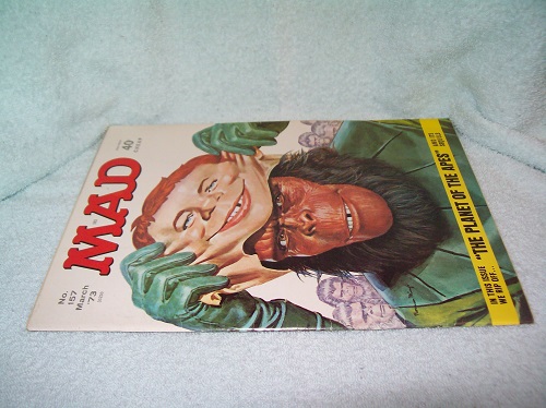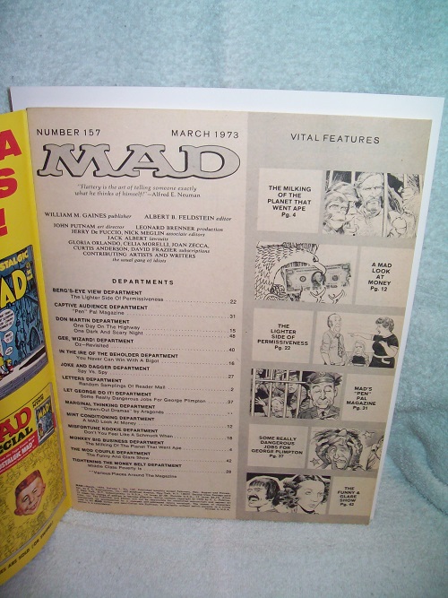 E. C. Publications, New York, 1973. Very Fine-; lays flat, light stress marks, bit of age toning, touch of wear on fore-edges. Rear cover fold-in NOT folded. Interior clean and unmarked, no rust on staples; 48 lightly tanned pages. Features: The Milking of The Planet That Went Ape, A MAD Look at Money, The Lighter Side of Permissiveness, MAD’s “Pen” Pal Magazine, Some Really Dangerous Jobs for George Plimpton, The Funny & Glare Show, and more.