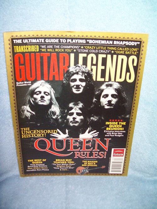 Future, New York, 2005. Magazine, 98 pages. Light edge and cover wear, bit of spine end wear, diagonal crease on rear wrap from mid fore-edge to past bottom middle edge; binding sound. Interior clean and unmarked; colour and black & white photos throughout; inking on p. 96 for part of song “Crazy Little Thing Called Love” is faded/lighter than on the other pages, possibly a manufacturing flaw. Includes the history of Queen and their rise to fame, the musicians, performances, reflections and music; plus The Ultimate Guide to Playing “Bohemian Rhapsody” and transcriptions of “We Are The Champions”, “Crazy Little Thing Called Love”, “We Will Rock You”, “Stone Cold Crazy”, and “Ogre Battle”.