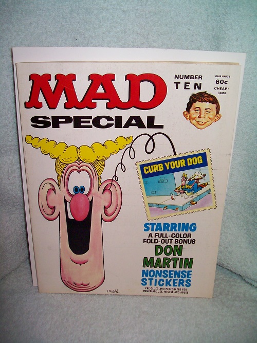 E. C. Publications, New York, 1968, 1969, 1973.  Very Fine-; light edge and cover wear, bit of age toning and discolouration to white areas; binding sound.  Rear fold-in NOT folded.  Interior clean and unmarked; 80 lightly tanned pages; includes insert still bound in with all stickers present.  Collection of various items from MAD Magazines of 1968, 1969, and 1973, plus Full-Color Fold-Out Don Martin Nonsense Stickers.