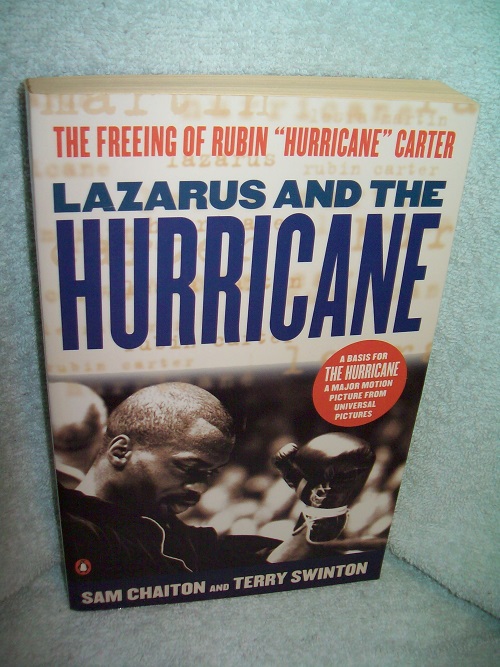 Penguin, Toronto, 2000, 2nd pr. ISBN 014028539-3. Movie Tie-In. Trade soft cover, 360 pages including Appendix A (lyrics to the song Hurricane by Bob Dylan and Jacques Levy), Appendix B (Carter case chronology), and Index. Unread remaindered copy with light edge and cover wear, bit of wrinkling to laminate; pages lightly tanned. ‘This astounding true story begins in a Brooklyn ghetto where a group of Canadians meet Lesra (Lazarus) Martin, a functionally illiterate child who wins their hearts. They take Lesra to Canada, adopt and educate him. Education opens new worlds for Lesra, and he happens upon a fateful book – The 16th Round by Rubin “Hurricane” Carter. … Wrongly convicted for a triple murder, Carter – the famous boxer, 1970s civil rights cause celebre and subject of the Bob Dylan song, “Hurricane” – languished in prison until Lesra and his Canadian friends sought him out and reinvigorated his legal battle. The inspiring relationship which ensued forms the heart of Lazarus and the Hurricane – a riveting legal drama, a fast-paced murder investigation and a moving account of hope and humanity and the indomitability of the human spirit.’ (from rear wrap)