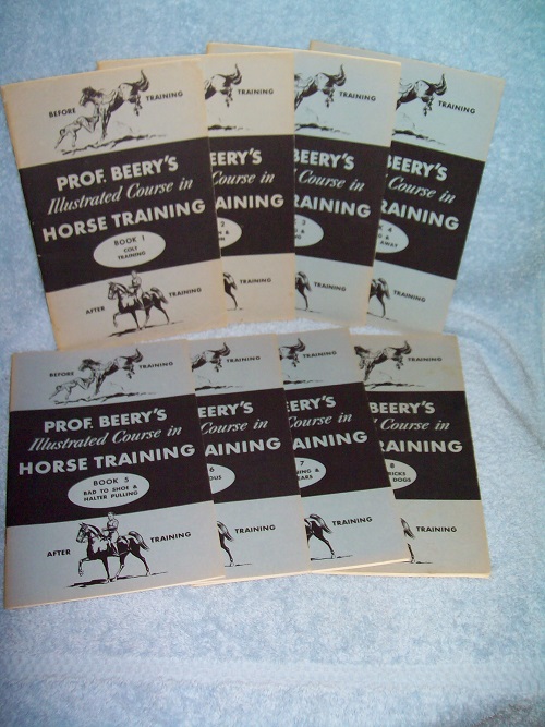 Beery School of Horsemanship, Pleasant Hill, OH, 1962. Blue card covers with stapled spines, showing some edge and cover wear, age-toning and a few creases. Each book is illustrated with black and white drawings, no ownership markings; interiors clean and unmarked. Book 8 has some soil on rear wrap and old wet mark in bottom margins of pp. 40-41. Book 1, 51 pages; Book 2, 40 pages; Book 3, 28 pages; Book 4, 19 pages; Book 5, 30 pages; Book 6, 23 pages; Book 7, 33 pages; and Book 8, 43 pages including Index. The set of 8 books covers Colt Training, Disposition & Subjection, Kicking & Balking, Shying & Running Away, Bad to Shoe & Halter Pulling, Miscellaneous Habits, Pony Training & Special Fears, and Teaching Tricks to Horses & Dogs.