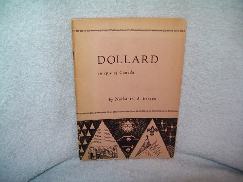 Thomas Nelson and Sons, Toronto, 1958.  Soft cover with stapled wraps, 50 pages including Foreword and Historical Preface to 1st edition.  Wraps show a bit of edge wear, small marks on front wrap, light creases, faded moisture mark along spine edge of rear wrap.  Interior clean and unmarked with lightly toned pages.  Epic tale in verse of Adam Dollard, approximately 17 other volunteers and about 40 Huron allies who fought at the Battle of the Long Sault against the Iroquois.  Dollard and his men died along with many Huron, after which the Iroquois returned to their home, possibly saving Ville Marie (Montreal) from being attacked by the Iroquois.