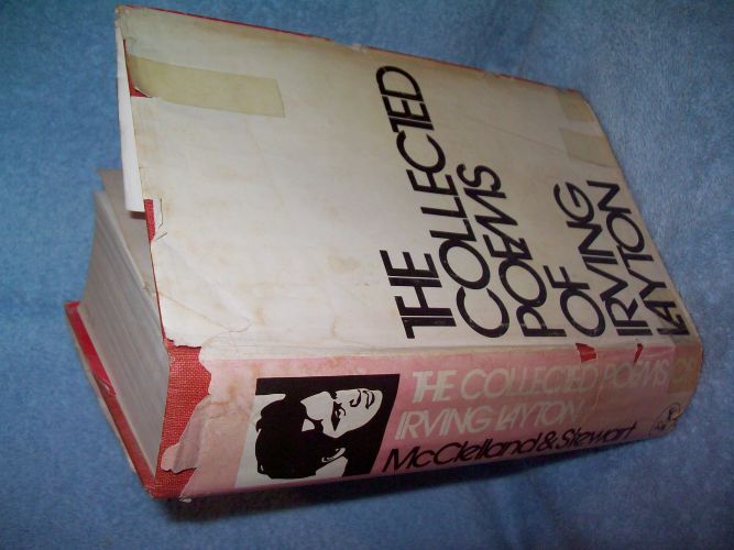 McClelland and Stewart, Toronto, 1971.  ISBN 0-7710-4837-8.  Hard cover, 589 pages followed by Index of Titles and Index of First Lines.  Red cloth with gilt lettering and decoration on spine; light edge wear, bit of corner wear, spine ends pushed with a bit of wear at tail end.  Binding sound with a bit of soil on bottom block.  Dust jacket with price intact shows wear, tears, losses, age toning, tape on front and verso.  Prior owner’s name and date inked on front pastedown and covered by front flap; remainder of interior clean and unmarked.  ‘This is the definitive collection of the work of a man many consider to be Canada’s greatest poet. … containing well over 600 poems …’ (from front flap)