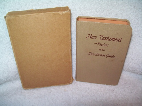 Westminster, Philadelphia, PA, no date but gift inscription dated 1946. Small hard cover (2 7/8 inches x 4 ½ inches), 320 pages followed by The Book of Psalms at 83 pages; pages 5-16 include Helps, Prayers, Familiar Hymns, and Poetry; King James Version. Very good; tan cloth with brown lettering on front board; rounded corners; outer page block tinted orange. Sacred Token paged filled in and dated 1946; remainder of interior clean and unmarked; comes in issued plain cardboard box.