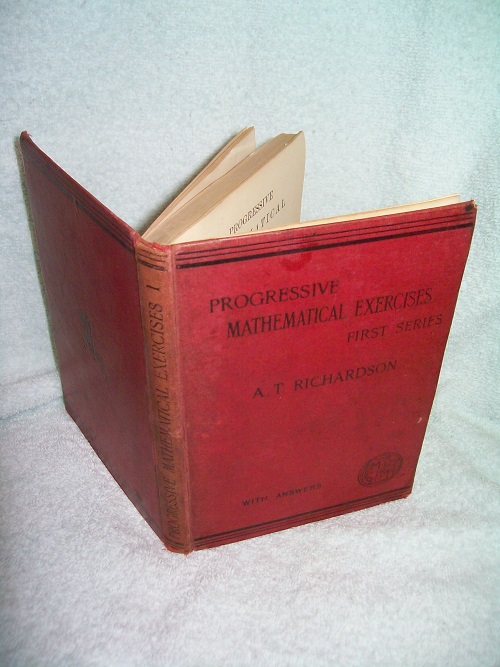 Macmillan, London, 1892, reprint. Hard cover, 232 pages including Answers. Red boards show cover, edge, corner and spine end wear, some marks and stains. Binding sound. Prior owner’s name inked on front paste down with date in pencil beneath, some ink transfer onto FEP. Binding cracked at FEP with all pages secure; off-setting at front and rear; occasional pencil marks and age spots/smudges; a few short edge tears, ding at upper corner of page block resulted in creases and short edge tears to a few pages. ‘… commences with exercises in Arithmetic suitable to boys who have gone through the First Four Rules, Simple and Compound, and are beginning Fractions; and Algebraical Exercises consisting chiefly of Numerical Values, Addition, and Subtraction. From these onward, the exercises rise in difficulty by careful gradations, reaching Cube Root and Compound Interest in Arithmetic, and Quadratic Equations in Algebra, at the end of the First Series.’ (from Preface)
