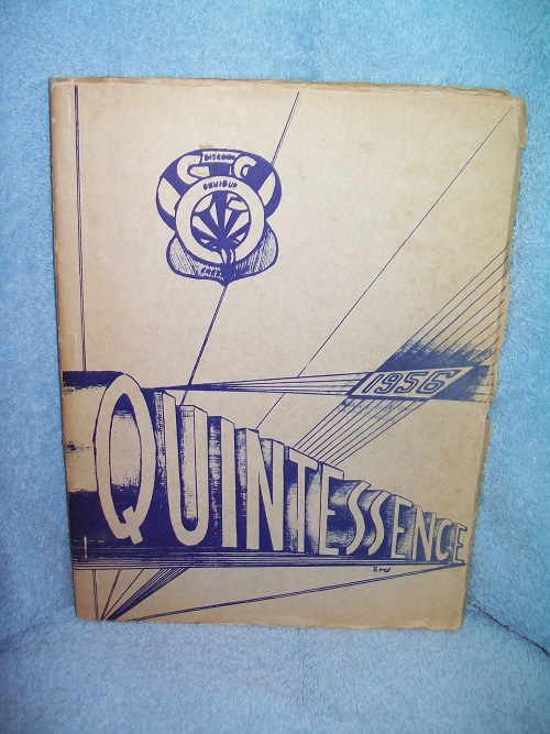 Self-published magazine/yearbook, 1956. Card covers with yapped fore-edges; front cover illustrated, rear cover promoting Queen’s University in Kingston for further education. Wraps show some edge and cover wear, short fore-edge tears, age-toning and a few age spots; binding sound. Interior pages lightly tanned with occasional age spot; one teacher’s autograph at rear of book. Illustrated with black & white photos and drawings. “Quinte’s second year is nearly completed. Her school activities continue to flourish. We have such a great deal to be proud of! We are proud, first of all, of our modern school and the beautiful big campus which is shaping up so quickly. We are proud to show off our gymnatorium, our labs, or the music and art rooms so many other schools lack now.” (from Editorial page)