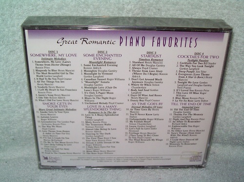 Reader’s Digest Music, Canada, 2004. 4 audio CDs, still in manufacturer’s shrink wrap. Disc 1 – Intimate Melodies/More Great Intimate Melodies; Disc 2 – Moonlight Romance/Romance Is In The Air; Disc 3 – Timeless Romance/ Eternal Melodies of Love; Disc 4 – Twilight Passion/Immortal Love.