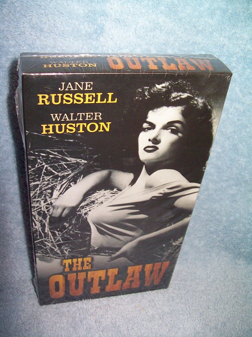 SBR Inc., 2000, VHS Video Tape, NTSC, Black & White, Not Rated, Recorded in EP mode; approx. playing time of 116 minutes. New in shrink wrap. Starring Jane Russell, Walter Huston, Jack Buetel, and Thomas Mitchell. ‘”The Outlaw” was the film debut of screen goddess Jane Russell, with former recluse billionaire Howard Hughes the power behind the camera. However, movie buffs will note that it was Hawks, not Hughes, that directed most of the film. Proclaimed a “sex-western” by certain critics, and considered an “outlaw” movie in more ways than one by the censors of the day, the film was held out of theaters for approximately two years before Russell showed the public what Hughes had carefully managed in private. “The Outlaw” became an instant hit, and Russell became the new femme fatale of Hollywood with producers standing in lines as long as audiences outside the movie houses. A fictional account of the Billy The Kid, Doc Holliday, Pat Garrett saga…’ (from rear box)